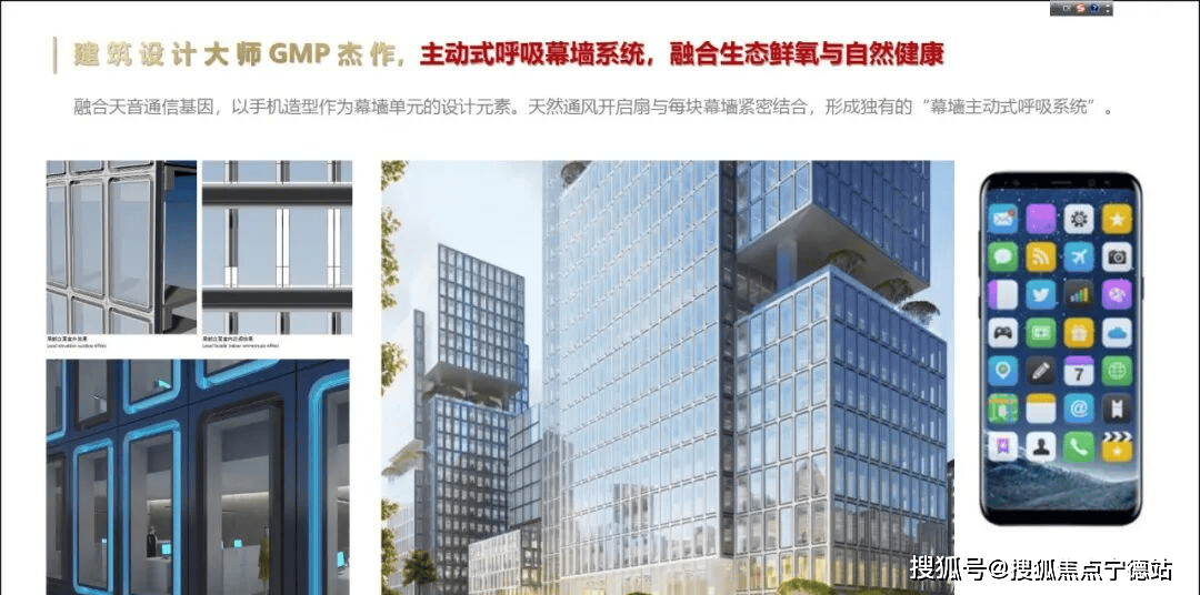 融合天音通信基因,以手机造型作为幕墙单元的设计元素。天然通风开启扇与每块幕墙紧密结合,形成独有的“幕墙主动式呼吸系统”。
